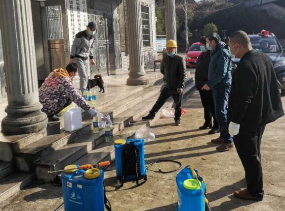 (图片说明:扶贫工作队利用晴好天气对全村约20公里村道及农贸市场和垃圾桶进行消杀)