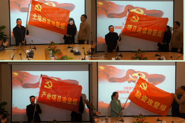 会上,凤溪公司党支部书记程晖波分别为“土地经营、项目建设、产业招商、对外融资”四个攻坚小组授旗,各攻坚组组长还就各自负责的攻坚任务作表态发言。
