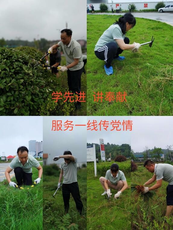 雨势越来越大,可是没有一个人放弃,大家穿起雨衣,继续干。许多人手都磨茧起泡或被杂草划伤,没有一个人叫苦喊累。领导干部带头做,年轻党员抢着干,身患腰疾的老党员忍痛不下火线,每个党员汗湿的衣服,满脚的泥泞,都传递出一种“学先进 讲奉献 服务一线传党情”的力量。