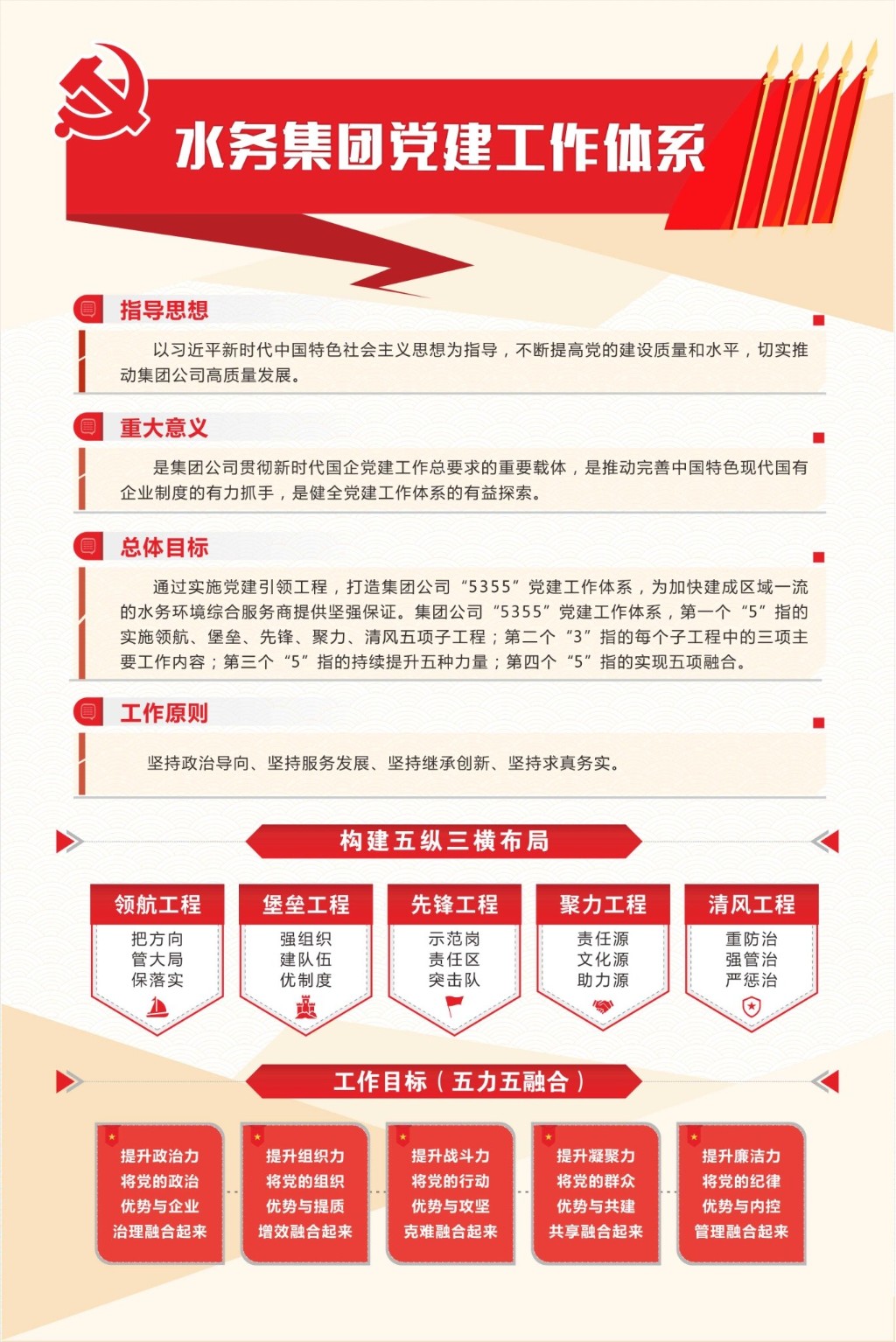 站在新起点,面对新要求,水务集团党委在深入学习贯彻全国国企党建工作座谈会会议精神和《中国共产党国有企业基层组织工作条例(试行)》等文件要求的基础上,不断深化认识、总结经验,创新性地提出“5355”党建工作体系,作为党建引领工程的主要载体和党建工作的行动指南,为加快建成区域一流的水务环境综合服务商,助力株洲实现“两个加快”提供了坚强保证。