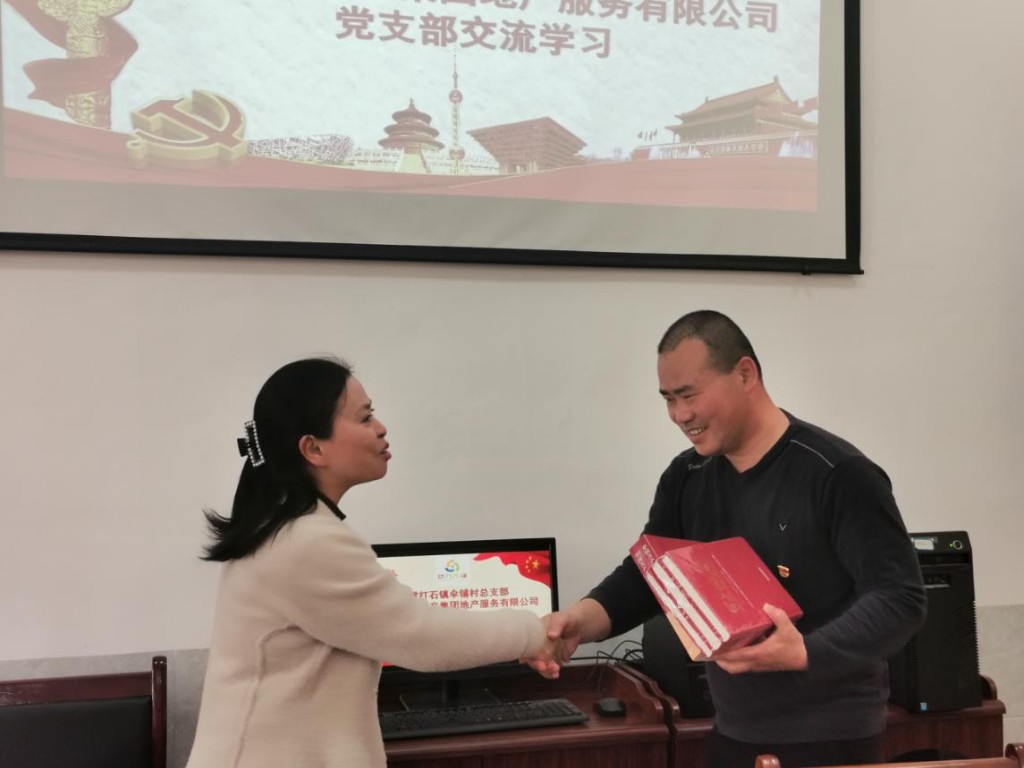 活动上,黄卉代表市地产服务公司党支部向雷打石镇伞铺村党支部赠送了党史书籍。