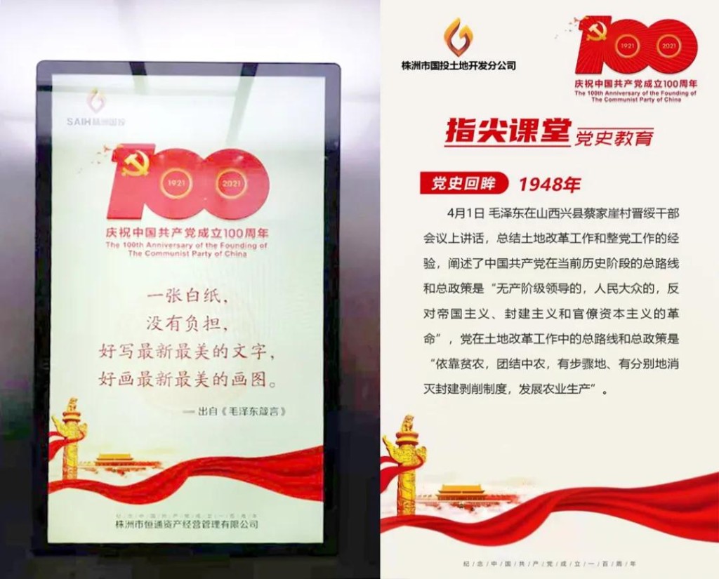 在市国投集团本部一楼电梯口,每天都能看到显示屏上播放的“党史上的今天”,有时是图片,有时是文字。利用等待电梯的碎片化时间,每天推送2条党史小知识,让广大员工随时随地学党史。