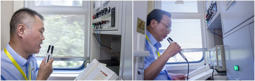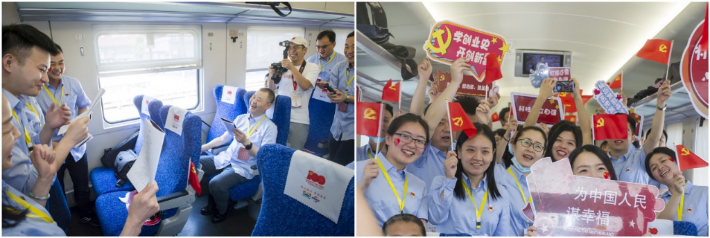 “没有共产党就没有新中国”“团结就是力量”“我和我的祖国,一刻也不能分割”……列车一路开行,车厢与车厢之间相互拉歌,嘹亮的歌声此起彼伏,热烈气氛一浪高过一浪,让人仿佛回到了激情燃烧、砥砺奋进的岁月。