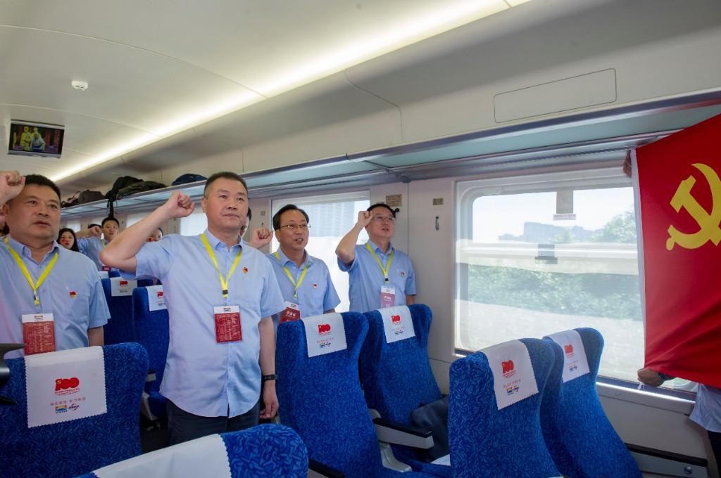“我志愿加入中国共产党,拥护党的纲领,遵守党的章程,履行党员义务,执行党的决定,严守党的纪律,保守党的秘密,对党忠诚,积极工作,为共产主义奋斗终身,随时准备为党和人民牺牲一切,永不叛党!”党旗前,谢锦辉带领全体党员高举右拳,庄严宣誓,铮铮誓言响彻整个车厢。