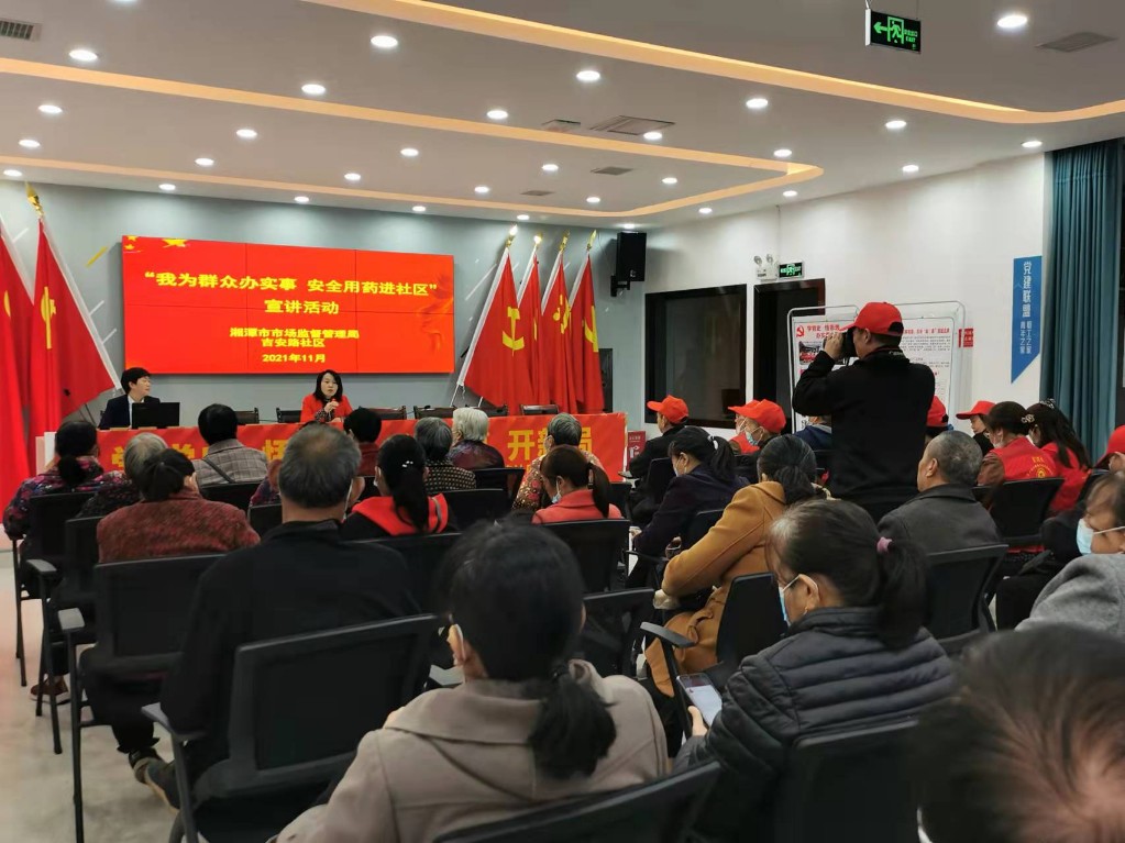 千金大药房湘潭区域6家门店代表响应党支部号召,联合湘潭市市场监督管理局开展“我为群众办实事、安全用药进社区”志愿服务活动。湘潭区域总经理颜梅围绕老年人安全用药指南,为志愿服务队员与吉安路社区居民代表带来“没有安全的药,只有安全用药”主题业务培训,重点提出了老年人用药的十大原则,贴合实际的培训赢得了大家的阵阵掌声。大家还针对生活中存在的用药事项提问,门店执业药师现场解答居民咨询,分发安全用药宣传资料,并为现场老年群众赠送随手礼安全用药包。