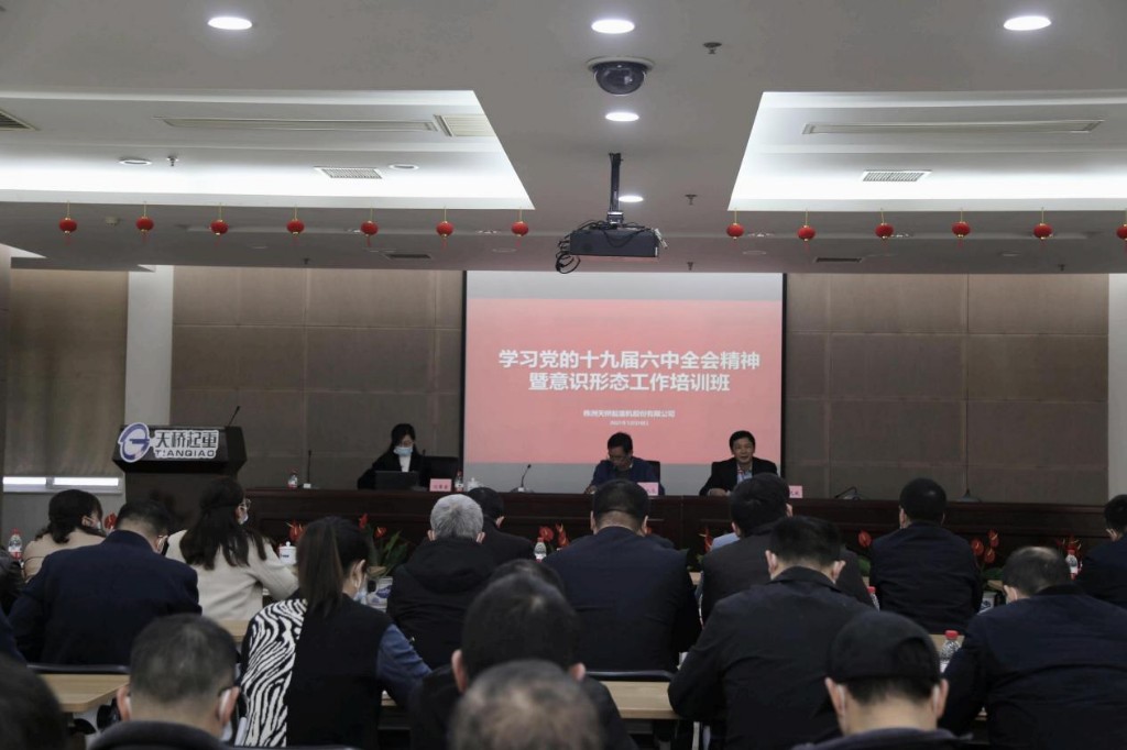 12月10日,株洲天桥起重机股份有限公司举办学习党的十九届六中全会精神暨意识形态工作培训班。该公司党委书记、董事长龙九文同志作开班讲话,党委副书记、监事会主席、工会主席黄元政同志主持会议,公司中高管、下辖各支部班子成员以及基层党员近100人参加培训。