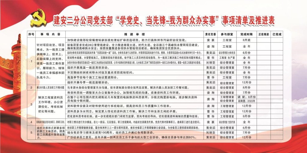 截至目前,建安二分公司党支部完成了“我为群众办实事”事项清单中的全部内容,以工作实绩实效检验了党史学习教育成效,在“我为群众办实事”过程中不断增强职工群众的获得感、幸福感和安全感。