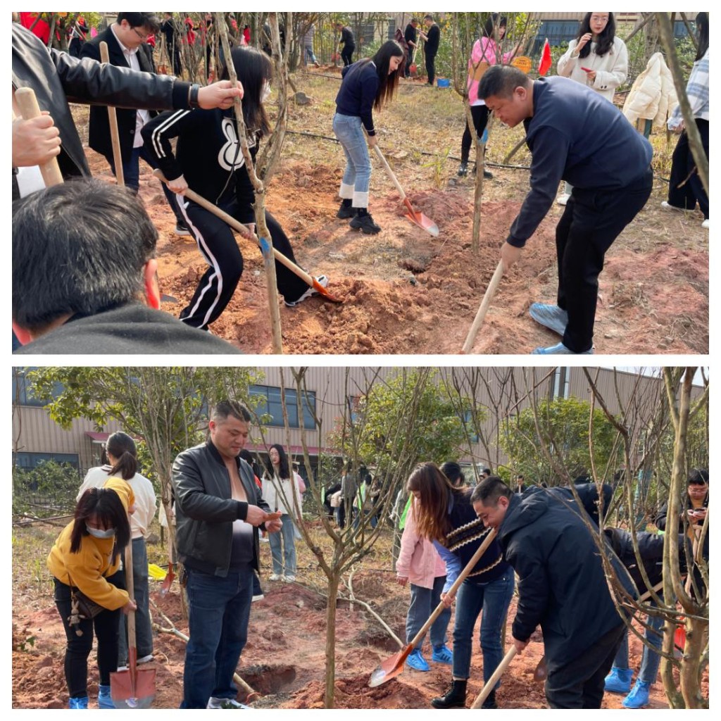 活动现场热火朝天,志愿者们撸起袖子拿着工具,两、三人一组,有的挥锹挖坑、移树扛苗,有的扶正苗木、回填覆土,大家分工协作,默契配合,每道工序都一丝不苟、认真细致,汗水在脸上直冒,但大家笑声不断,一派热闹忙碌的劳动景象。没多久,几十棵树苗就整齐屹立在千亿大道的绿化带上,尽情沐浴着三月暖阳,为这片土地增添了新的绿意。