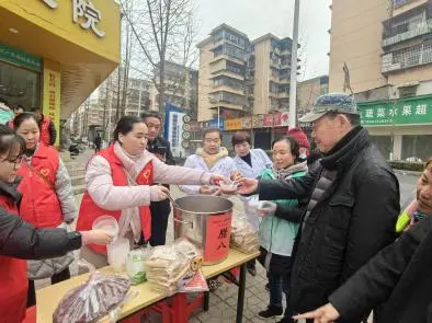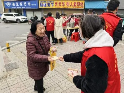 活动当天,志愿者们早早带着熬制好的腊八粥赶到上月塘社区。活动现场热闹非凡,社区居民自主排起长队,志愿者们热情地将一碗碗热气腾腾的腊八粥送到居民手中,并送上节日的问候与祝福。社区居民王奶奶说:“喝了这碗热气腾腾的腊八粥,感觉年味更浓了!”对于一些行动不便的高龄老人,志愿者们展开了特殊的“粥”到服务,把盛满幸福美好的腊八粥上门送到他们的家中。同时,还将提前分装好的腊八粥料包送给在户外辛勤工作的环卫工人、外卖员、警务执勤人员……让这碗有温度的腊八粥能在寒冷的冬天为他们驱走寒意。