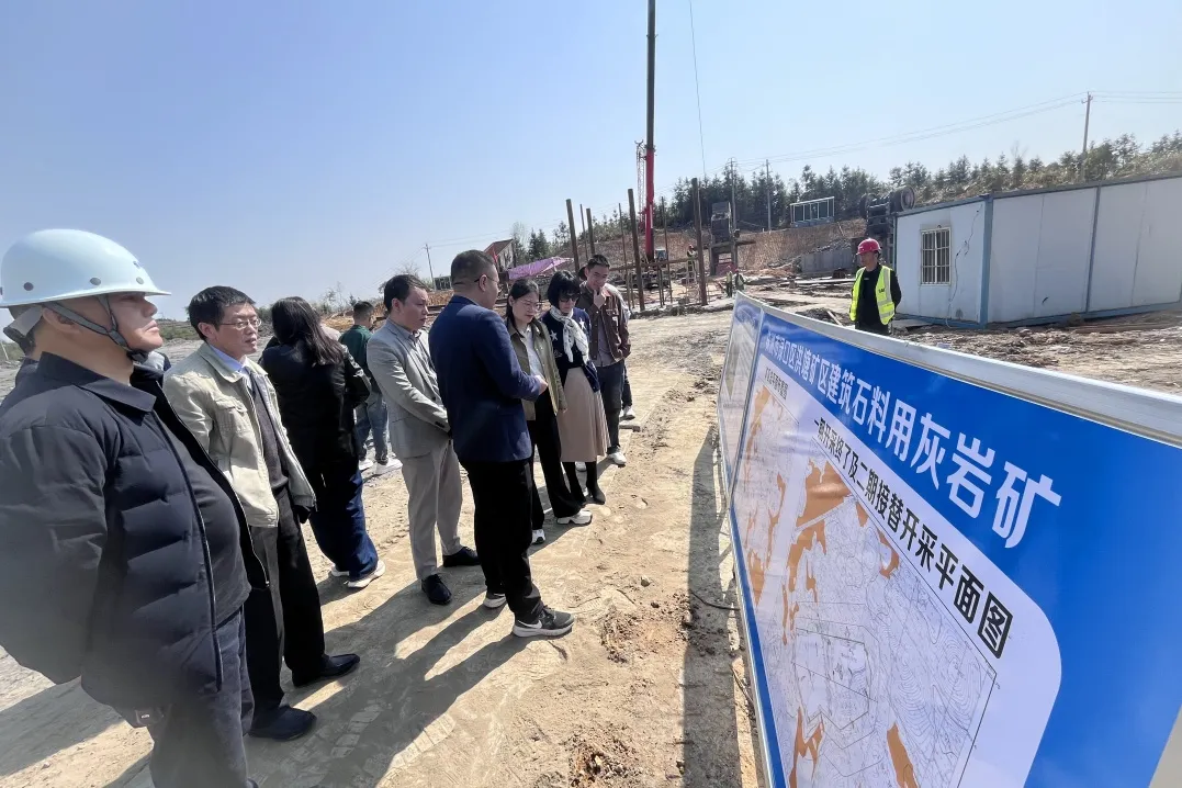 活动中,全体党员实地参观了洪塘建筑石料用灰岩矿。项目公司负责人详细汇报了项目建设进展情况、下一步工作计划以及目前存在困难。现场,开采区如火如荼进行着表土剥离,加工区紧锣密鼓进行核心设备安装等工作,项目有望在4月底实现投产。双方就洪塘矿项目面临的难点、堵点进行了深入交流与探讨,并对地矿公司工作提出意见建议。
