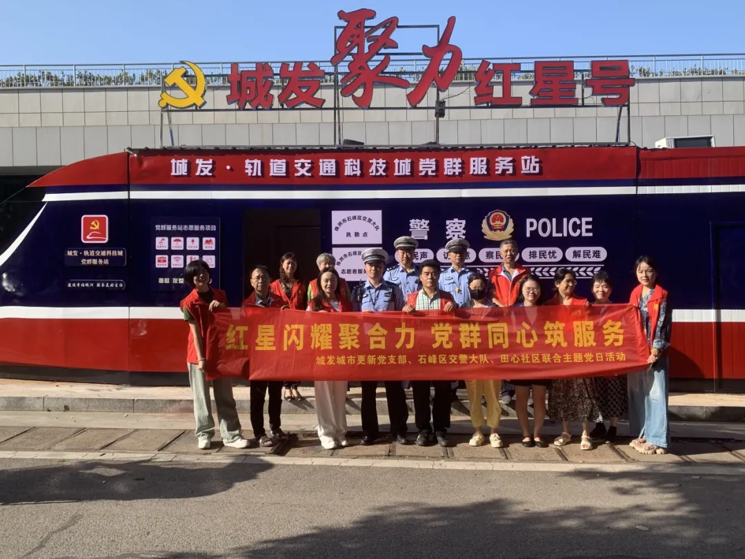 城发·轨道交通科技城党群服务站由 “城发聚力红星号” 升级而成,位于石峰区中车广场旁,是集党群服务与便民服务于一体的综合性平台。服务站整合城发集团、石峰区社会工作部、石峰区交警大队、田心街道等多方资源,设党建展示、志愿服务、交警执勤、居民议事等功能区,其与改造后的中车广场形成联动,构建 “15分钟服务圈”,以 “红色引擎” 提升区域服务水平,成为基层党建与民生融合的示范阵地。(市城发集团)
