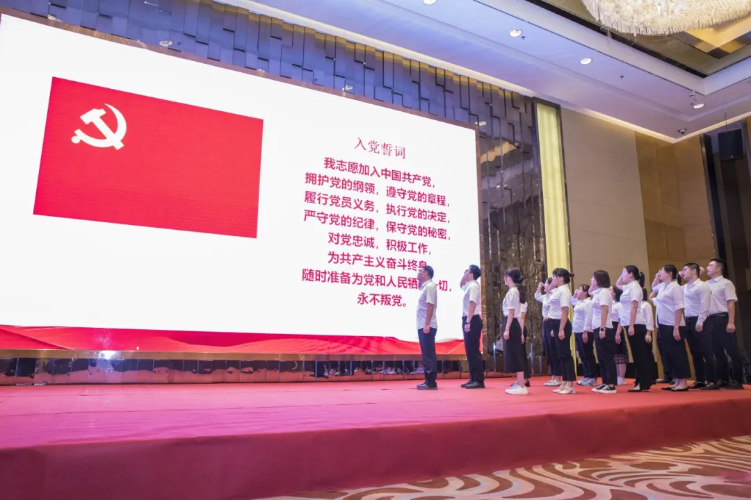 新党员面向党旗庄严宣誓,全体党员共同重温入党誓词,铿锵誓言彰显了千金人对党的绝对忠诚和为人民健康事业不懈奋斗的坚定信念。
