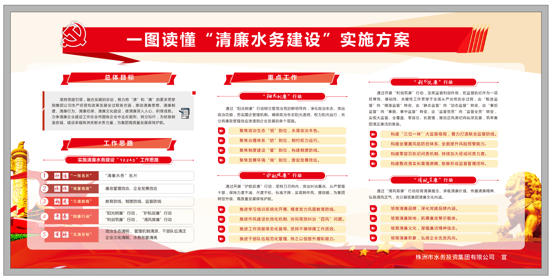 今年2月,水务集团印发《推进清廉水务建设的实施方案》,提出清廉水务建设“12345”工作思路。通过打造一张“清廉水务”名片、提促廉政管理和企业发展“双重效应”、构建制度、监督、教育“三道防线”、开展阳光树廉、护航促廉、利剑筑廉、清风育廉“四廉行动”,实现政治生态清明、管理机制清源、干部队伍清正、企业文化清朗、水务形象清亮“五清目标”。