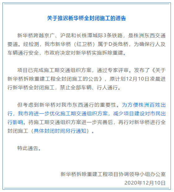 鉴于新华桥全封闭施工推迟,原定于12月10日开始12条公交线改道行驶的调整暂时取消,公交车继续按原线路行驶,待正式封桥后再另行公示。敬请广大市民朋友注意,提前做好出行规划。