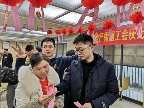整个大厅在大红灯笼的映衬下显得格外热闹喜庆,猜中答案的员工喜出望外地拿着谜面去兑换奖品。活动现场充满了欢声笑语,1个小时不到,“灯谜链”上的灯谜便被大家一一猜中了。