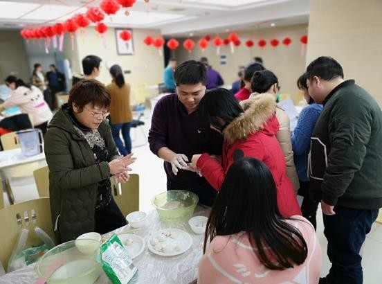 猜完灯谜的活动现场依旧一派热闹景象,领导们带领大家手工制作汤圆,其乐融融。
