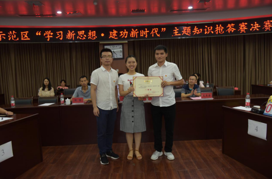 知识抢答赛采取闭卷作答,包括必答题、抢答题、机会题三个环节。本次抢答赛的6支队伍,除了集团代表队外,分别由示范区部门单位、镇街组成,在此前的两场初赛中均展现出了不俗的实力,在决赛现场,更是展现了昂扬向上的精神面貌,充分展示了各单位的良好形象和参赛队员的水平。