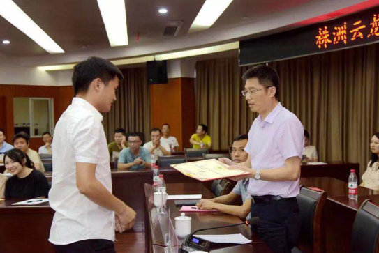 (区党务工作部部长文毅给集团参赛选手颁奖)