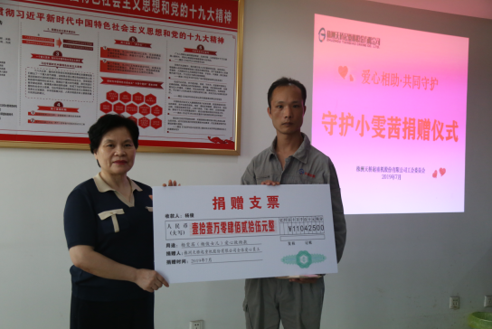 在了解到小雯茜的具体情况后,党群工作部相关人员立即行动起来,在公司党委、工会的指导下,筹划发起“爱心相助·共同守护”募捐活动,并在公司微信公众号及OA上同步了募捐倡议书,得到了全体爱心员工的广泛关注。募捐活动以分工会为基础,共设置12个募捐点。一时间,爱的暖流汇聚厂区。截止到7月15日,共收到12个分工会751人次的爱心善款110425元,该款项在第一时间交到了小雯茜父亲杨俊的手中,并在OA上进行了公示。