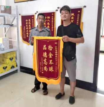 8月3日上午小区7栋业主王女士一家前来物管处认领失物,经现场工作人员再三核实确认后,将价值一万多元的黄金项链归还。业主对于贵重物品丢失数天后还能失而复得,特别感动,同时也对物业公司能有这样高尚品德的员工表示高度赞扬。8月9日,王女士一家将一面绣着“品德高尚、拾金不昧”的锦旗送到物管处,再次表达了谢意。凌国军同志这种拾金不昧的行为,是教投集团物业公司良好企业文化和员工职业操守的体现,有效传递了正能量。