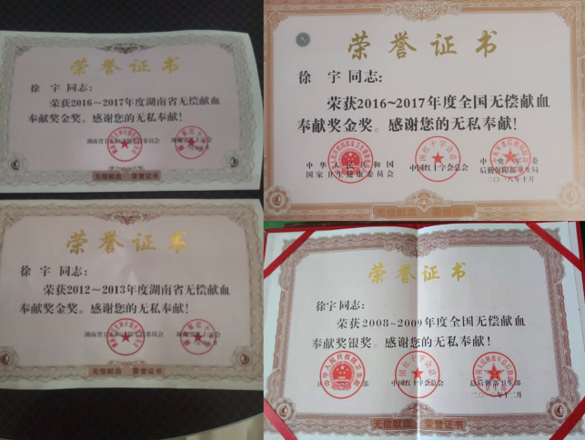 无偿献血证、捐献造血干细胞荣誉证书、全国无偿献血奉献金奖荣誉证书……这些荣誉是徐宇多年坚持无偿献血所获得的,见证了他的奉献之路。