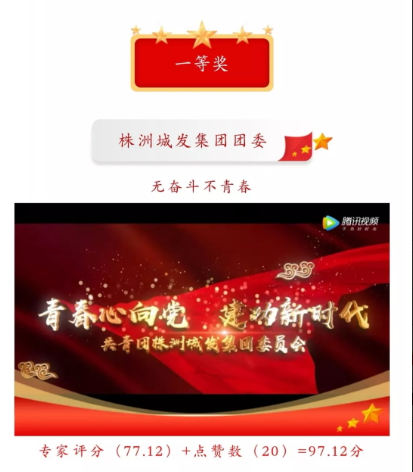 日前,从团市委传来喜讯,在株洲市委网信办、共青团株洲市委联合举办的株洲市“我和我的祖国”短视频大赛中,城发集团团委选送的作品《无奋斗 不青春》,以专家评分(77.12)+点赞数(20)=97.12分的好成绩喜获一等奖,同时,在网络投票中,以100490票点赞数获得最佳人气奖。
