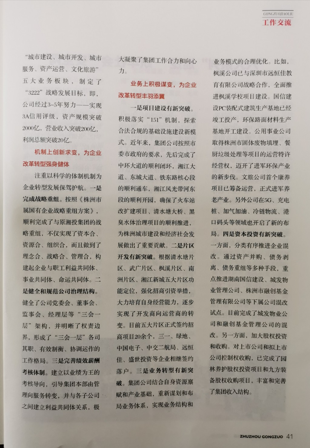 《株洲工作》2020年第四期刊登市城发集团党委书记、董事长谭跃飞署名文章《主动应变抓机遇 积极谋变促转型----市城发集团转型发展迈开新步伐》。原文如下: