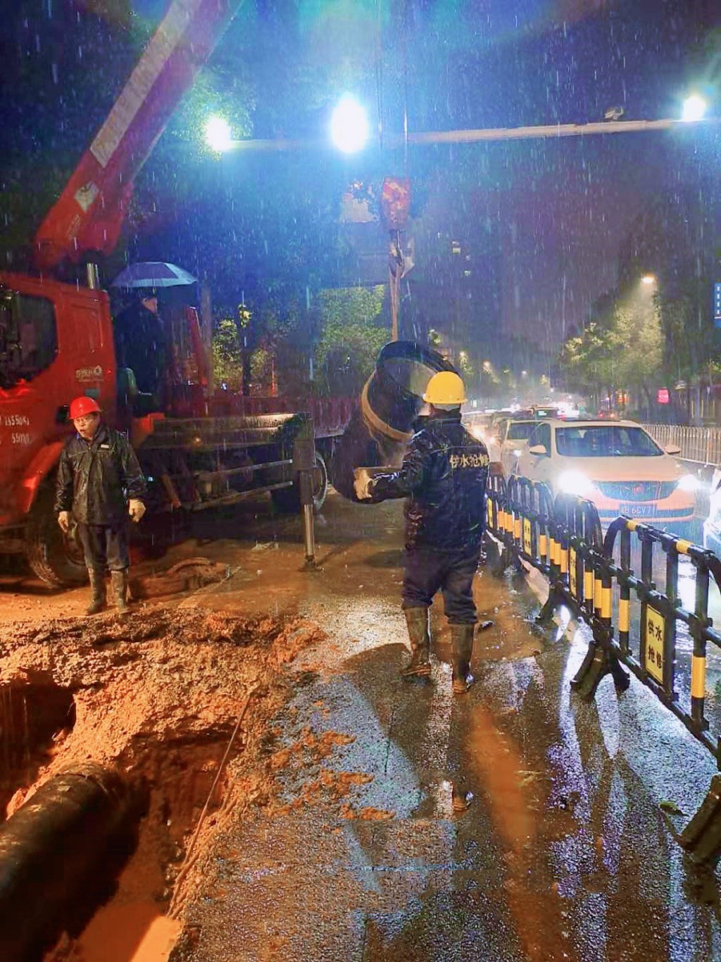 廖飞跃接到电话后立即组织抢修队伍奔赴现场、实地勘查,与交警协调撤去隔离栏,调配抢修设备,召集抢修队伍,争分夺秒抢修水管。