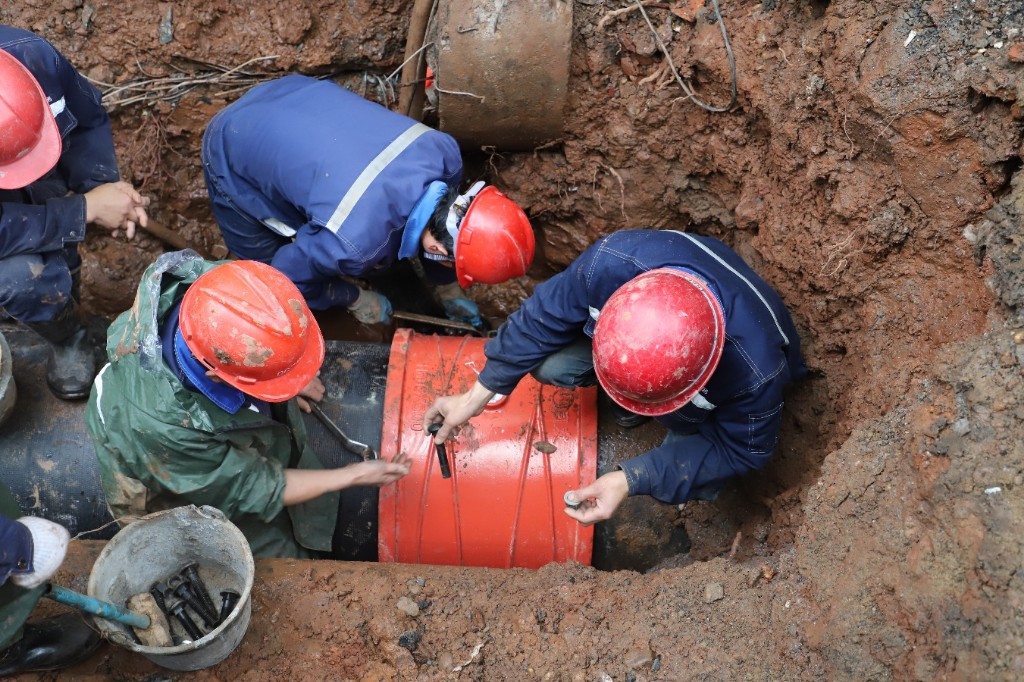 下午5点,抢修任务圆满完成,现场重新铺设了一段长达5米的DN600球墨铸铁管,管道运行正常后,晚上8点管线恢复送水,比原定计划提前了整整8小时。