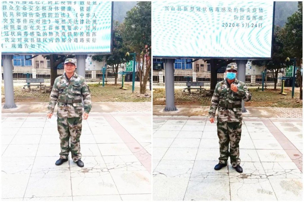 疫情期间,公司开辟了线上的业务培训学习。石先国每天晚上远远地扯着一根排插,给笔记本电脑接上电源,借着站哨岗昏暗的灯光,在寒风里边站岗边学习。他在朋友圈发了一张穿着军装站岗的照片,并写下:“千金人在哪里都是冲锋在前!”