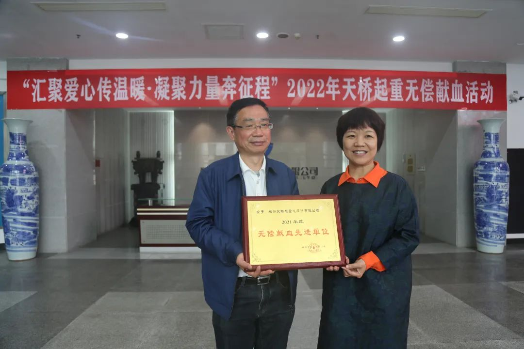 ▲株洲市中心血站向天桥起重授予“无偿献血先进单位”荣誉称号。该公司党委书记、董事长龙九文代表公司接受授牌,并与中心血站负责人亲切交流。