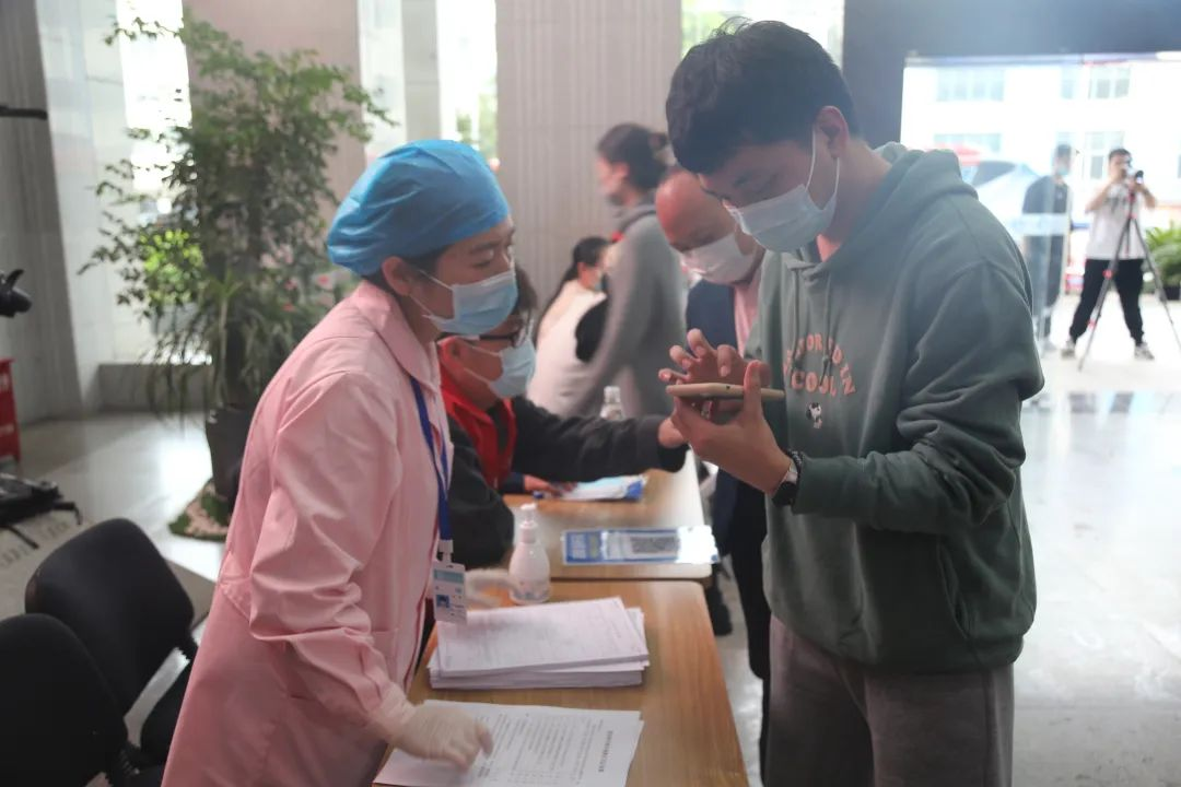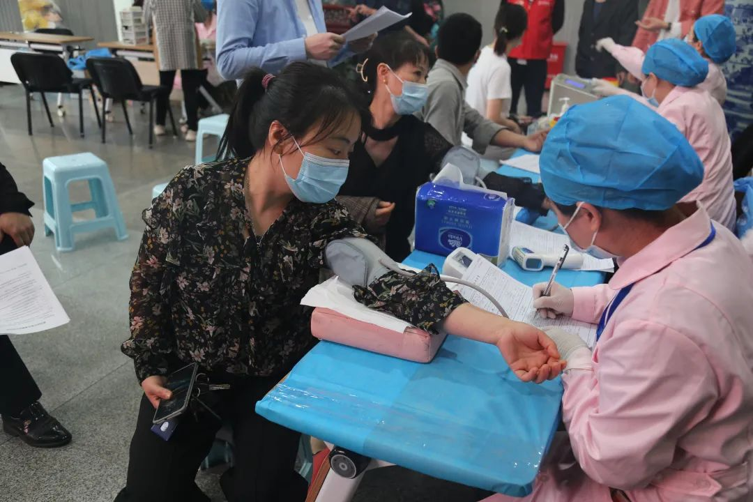 ▲在医护人员指导下,参与献血的同志认真填写献血登记表、量血压、抽血化验,耐心等待结果