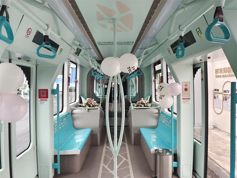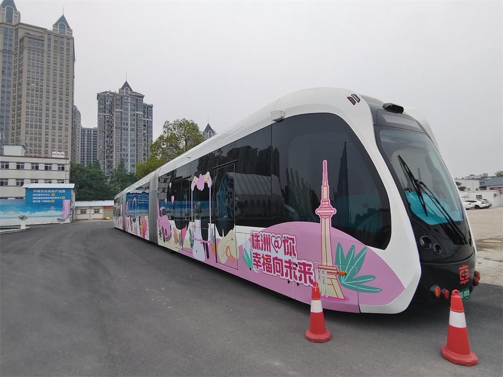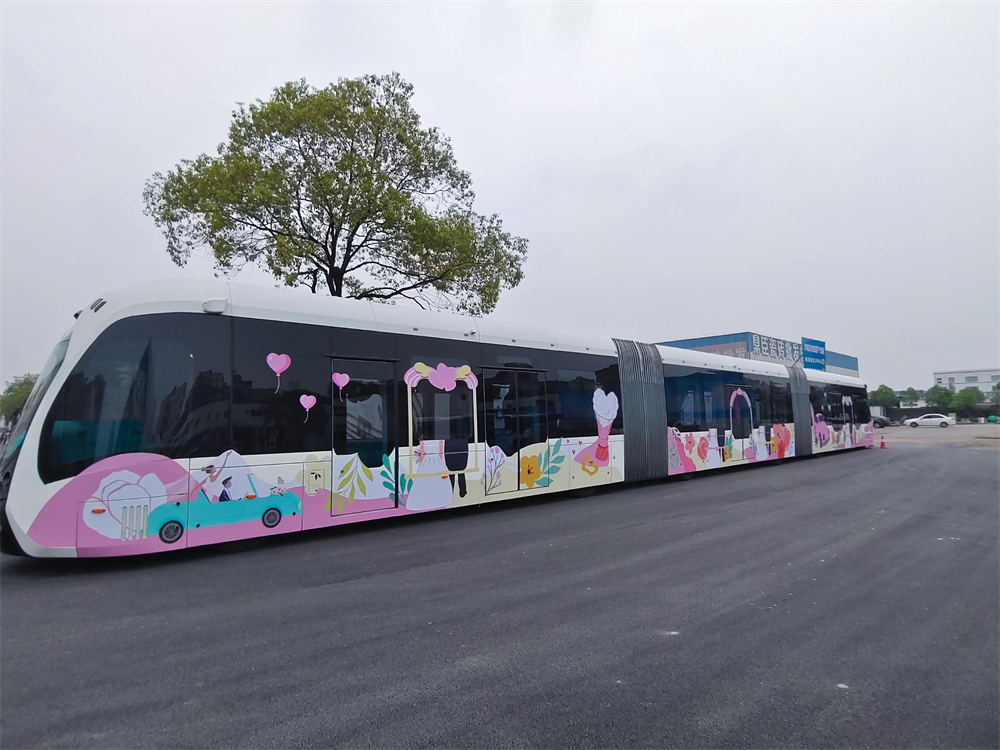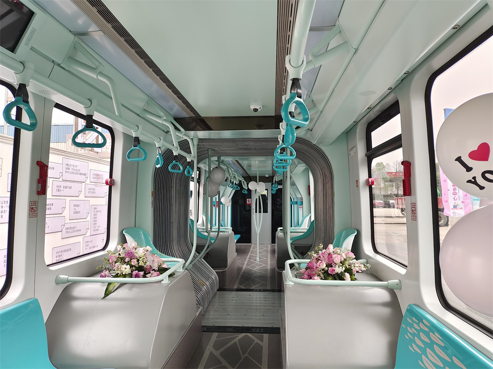 本次活动由株洲公交发展股份有限公司A2线智轨车承办接亲活动。为保证活动圆满举行,该公司A2线工作人员对车辆进行全面清洗消毒,对车况进行严密排查。经过精心布置,昔日普普通通的智轨车华丽变身,满载温馨、浪漫和爱意,穿行在株洲的大街上。只见车头鲜花迎风招展,车身粉色装饰浪漫唯美,张贴“株洲@你 幸福向未来”的字样,车厢内装饰着各式鲜花、气球、拉花。?一路上,智轨婚车深深吸引着市民的眼光,大家纷纷掏出手机拍照留念。