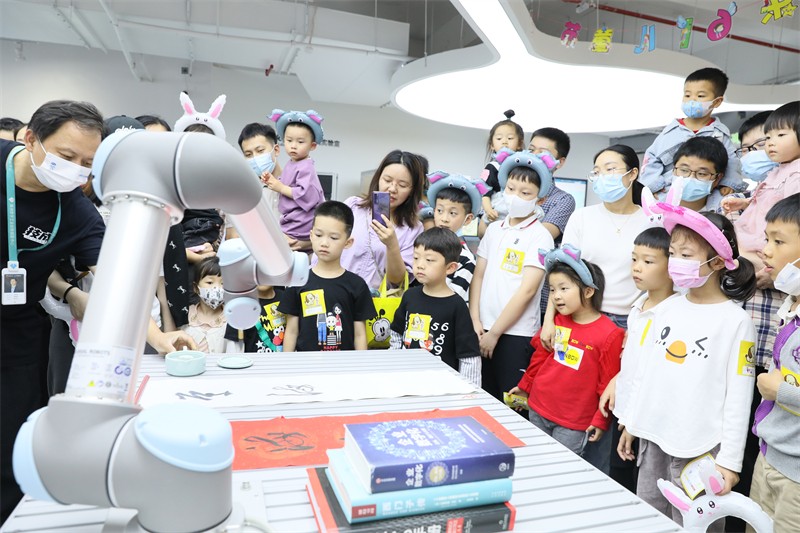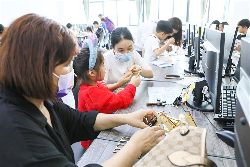 活动安排了数创中心游览、观看人工智能影片、亲子益智实践手工课程及趣味沙龙等多个环节,内容丰富、趣味盎然、寓教于乐。小朋友们在家长的陪伴下,积极参加活动,有的模仿机器人跳着机械舞,有的开心参与问答,有的和爸爸妈妈一起体验投壶和两人三足游戏,还有的兴致勃勃参与现场打卡活动,玩遍每一个游戏。活动结束后,每位小朋友还获得了精美小礼物,现场洋溢着欢声笑语。