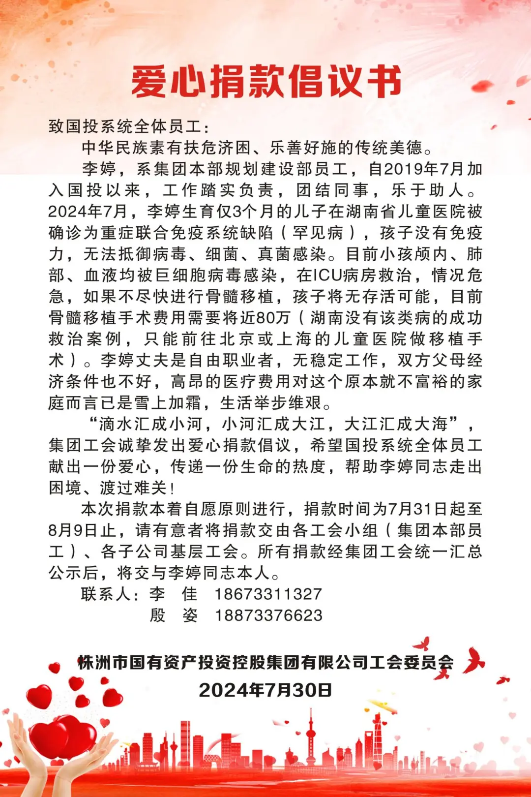 近日,一场由市国投集团工会组织发起的爱心捐款活动在集团本部和各子公司中接力开展,为集团员工李婷被确诊为重症联合免疫系统缺陷(罕见病)的儿子募得善款14万余元。
