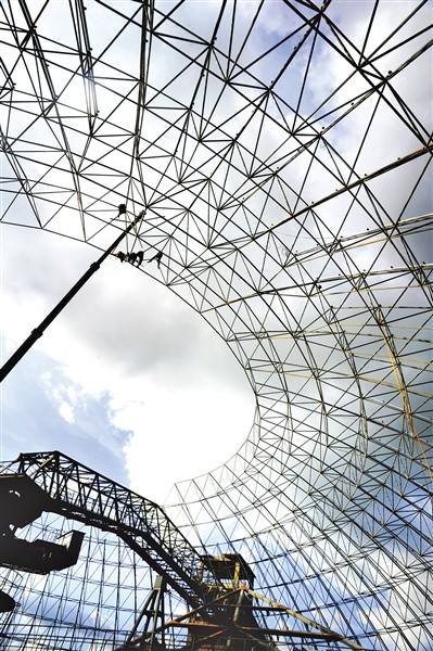 工人正在搭建福建水泥九号窑煤均化堆场。