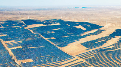 位于毛乌素沙地边缘的国家能源集团宁夏电力公司200万千瓦光伏项目施工现场,工人们正在架设一排排蓝色的光伏板。该工程是目前国内单体规模最大的集中式智慧光伏电站,也是“西电东送”重要通道的绿色电源点,建成后每年将为华东地区输送37亿度绿色电能,减少二氧化碳排放310万吨。